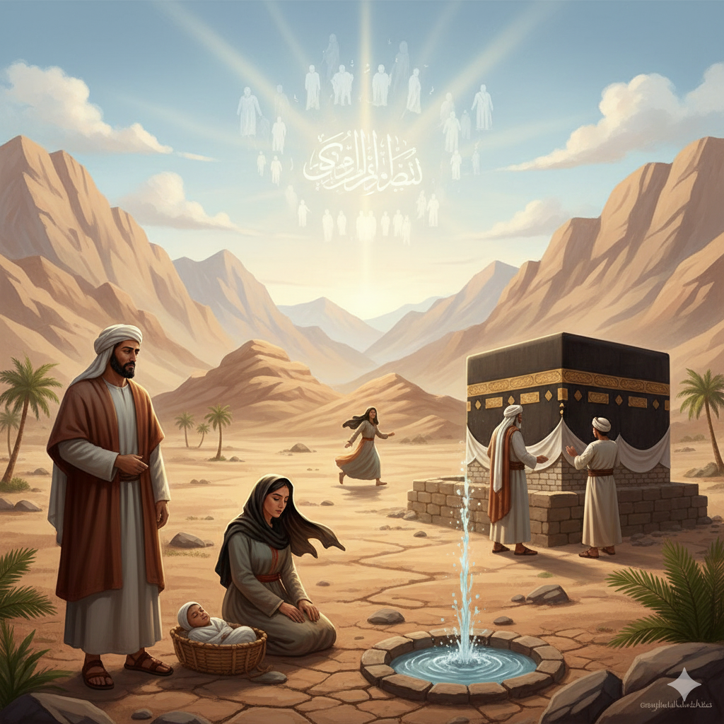 Ribuan tahun lalu, Nabi Ibrahim AS menerima perintah dari Allah SWT untuk membawa istrinya, Hajar, dan putranya yang masih bayi, Ismail, ke sebuah lembah gersang yang tidak berpenghuni. Lembah itu adalah Bakkah (Makkah). Di sana, tidak ada sumber air, tidak ada tanaman, dan tidak ada manusia lain.